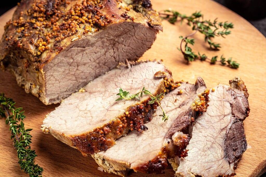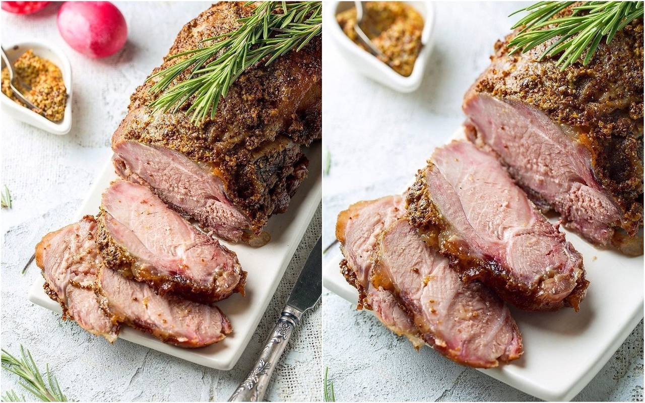 На горчичный слой выкладываем свинину уже обжаренную, обмазываем ее с боков и сверху также зерновой горчицей. Фольгу сворачиваем, но не сильно плотно. Печем в духовке полчаса на 240 градусах, а потом убавляем до 220 и ждем еще 50 минут. Можно сделать небольшой надрез и проверить готовность, должен вытекать прозрачный сок.